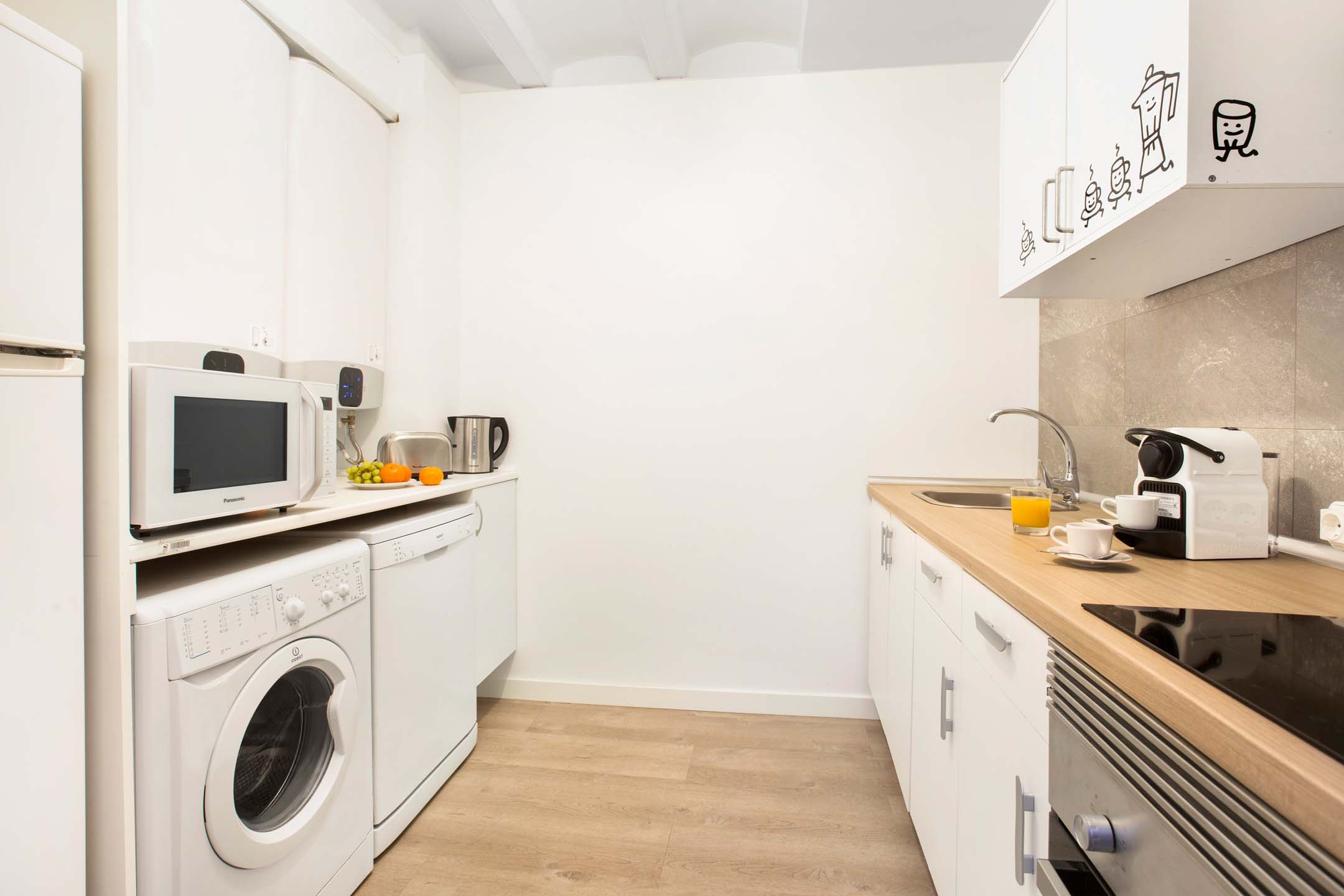 While you may want to spend your time exploring Barcelona's famous eateries, sometimes there is nothing like a home-cooked meal. And this apartment features a fully furnished kitchen with everything you need to make meal preparation easy. Custom cabinets provide plenty of space to store your family's favorite groceries, and modern appliances making it easy to cook meals for your hungry crew.